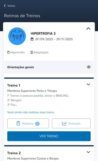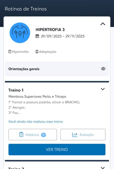 - 📱 Acesso ao app, com vídeos demonstrativos, indicação de carga e uma série de outras funcionalidades, inclusive para você iniciar o treino, acompanhar tempo de intervalos, e sua evolução.